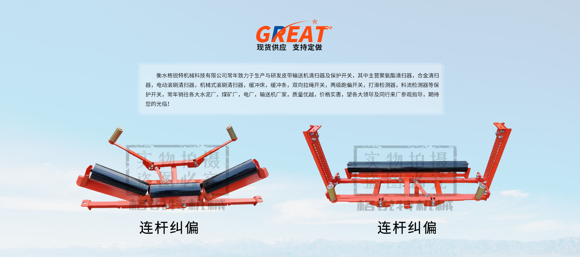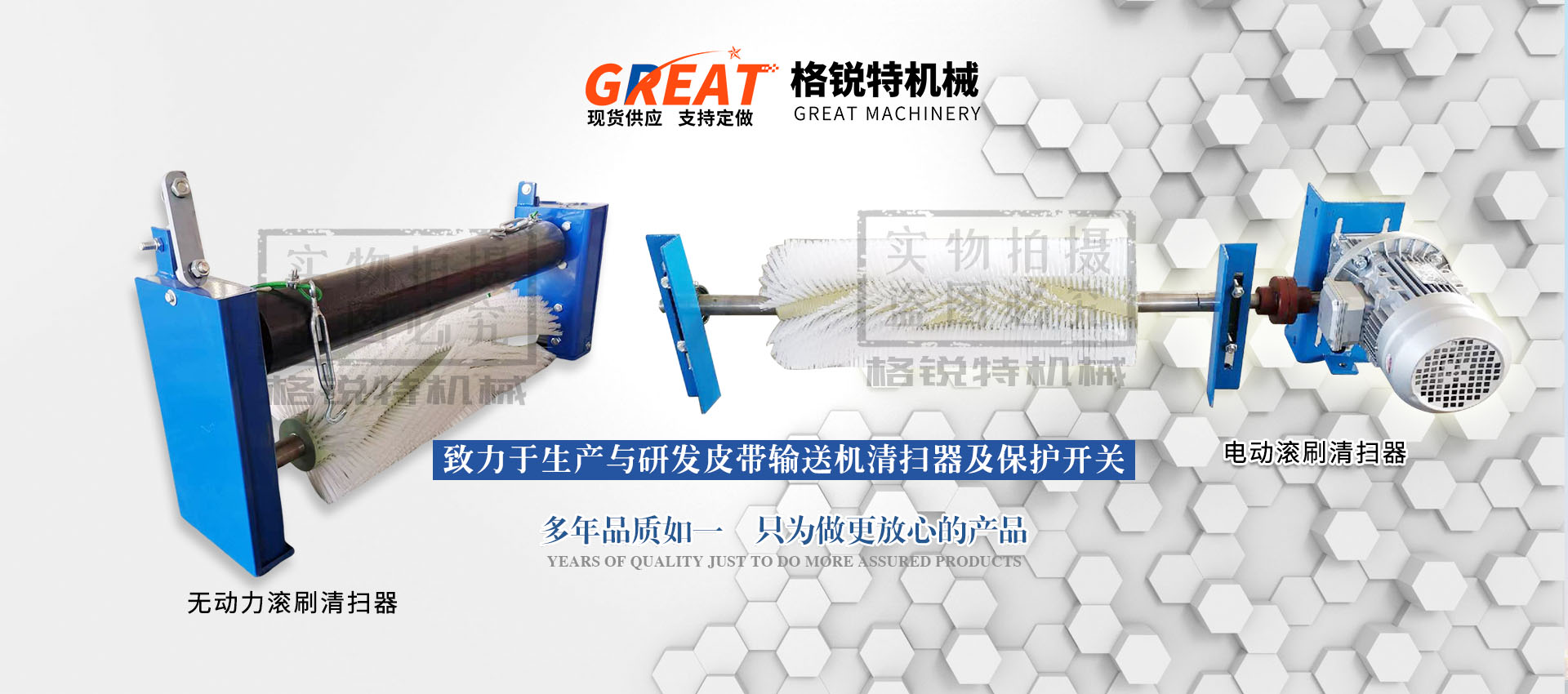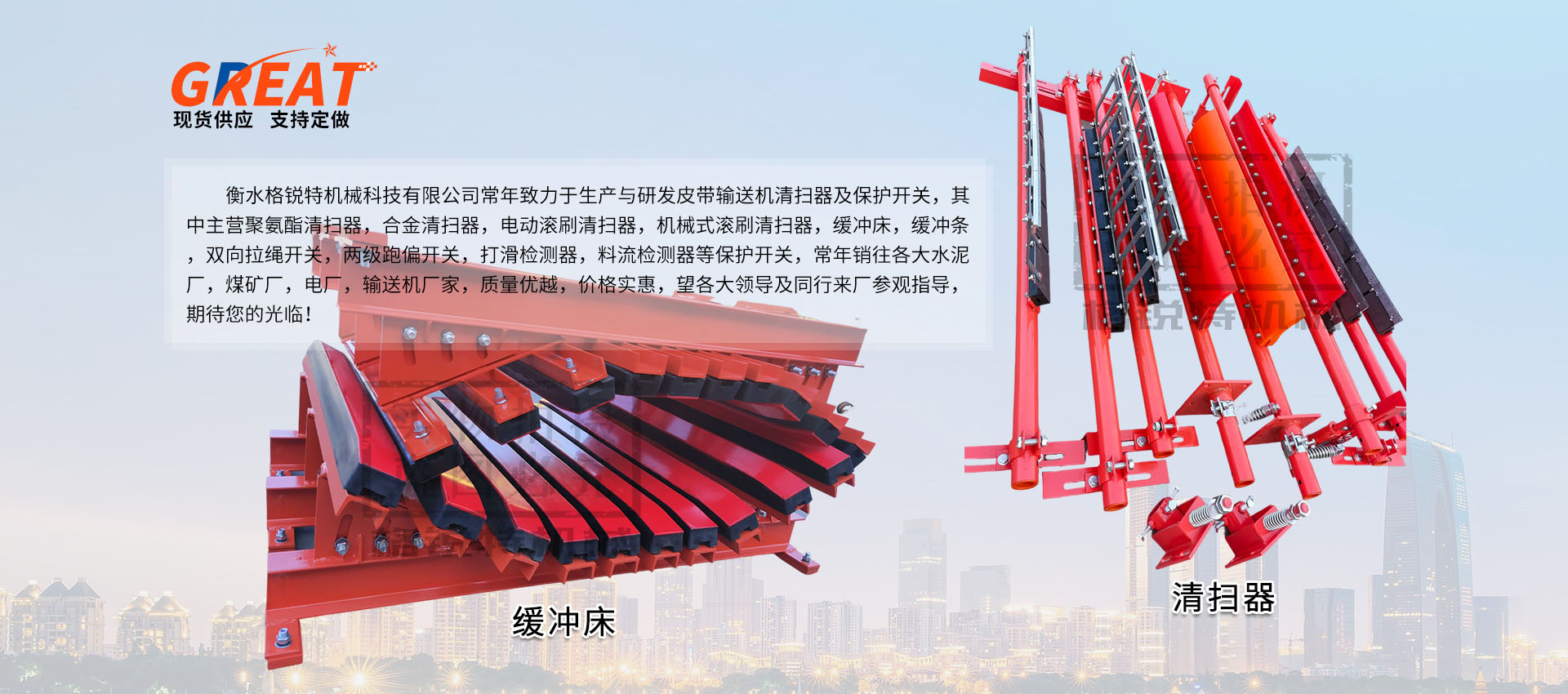 衡水格銳特機(jī)械科技有限公司常年致力于生產(chǎn)與研發(fā)皮帶輸送機(jī)清掃器及保護(hù)開關(guān),其中主營聚氨酯清掃器,合金清掃器,電動滾刷清掃器,機(jī)械式滾刷清掃器,緩沖床,緩沖條,雙向拉繩開關(guān),兩級跑偏開關(guān),打滑檢測器,料流檢測器等保護(hù)開關(guān),常年銷往各大水泥廠,煤礦廠,電廠,輸送機(jī)廠家,質(zhì)量優(yōu)越,價(jià)格實(shí)惠,望各大領(lǐng)導(dǎo)及同行來廠參觀指導(dǎo),期待您的光臨!!!